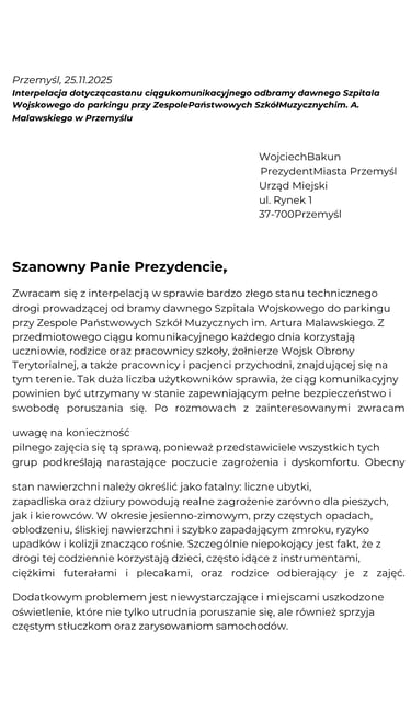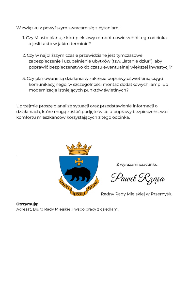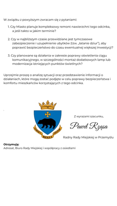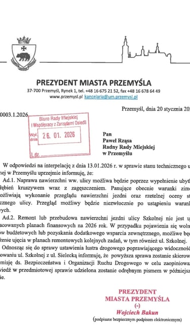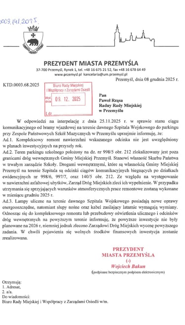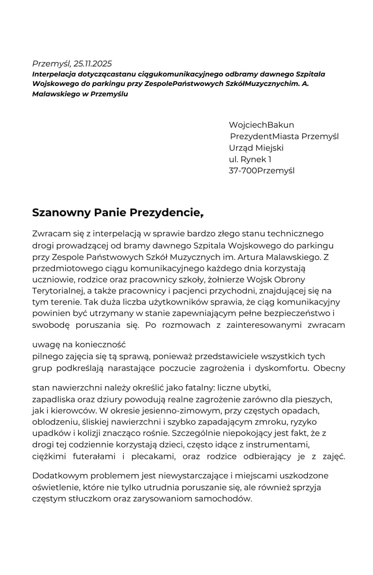 Interpelacja dotycząca stanu ciągu komunikacyjnego od bramy dawnego Szpitala Wojskowego do parkingu przy Zespole Państwowych Szkół Muzycznych im. A. Malawskiego w Przemyślu