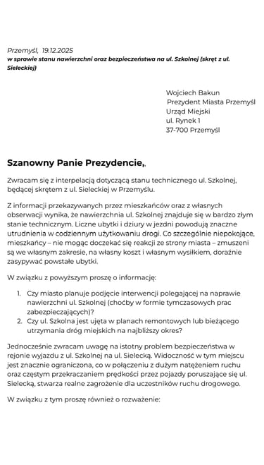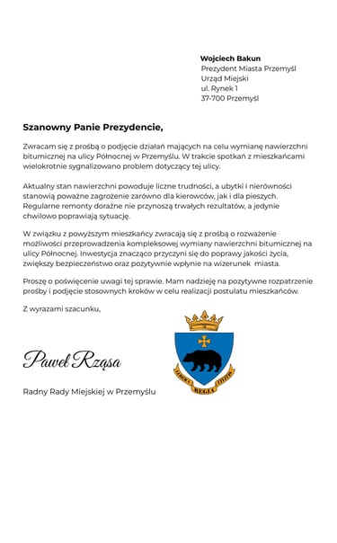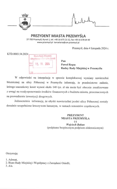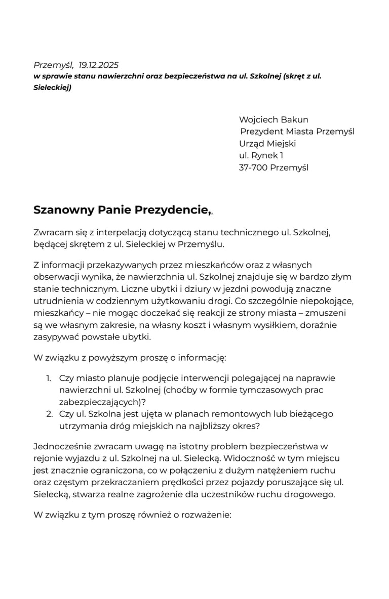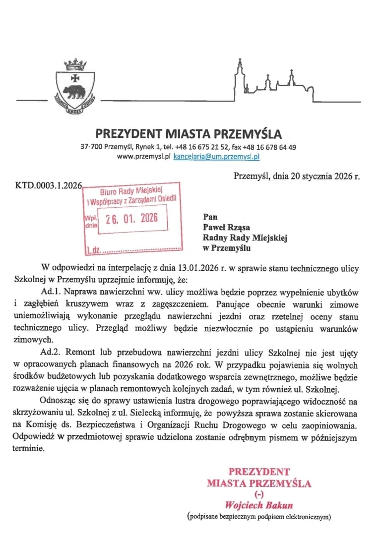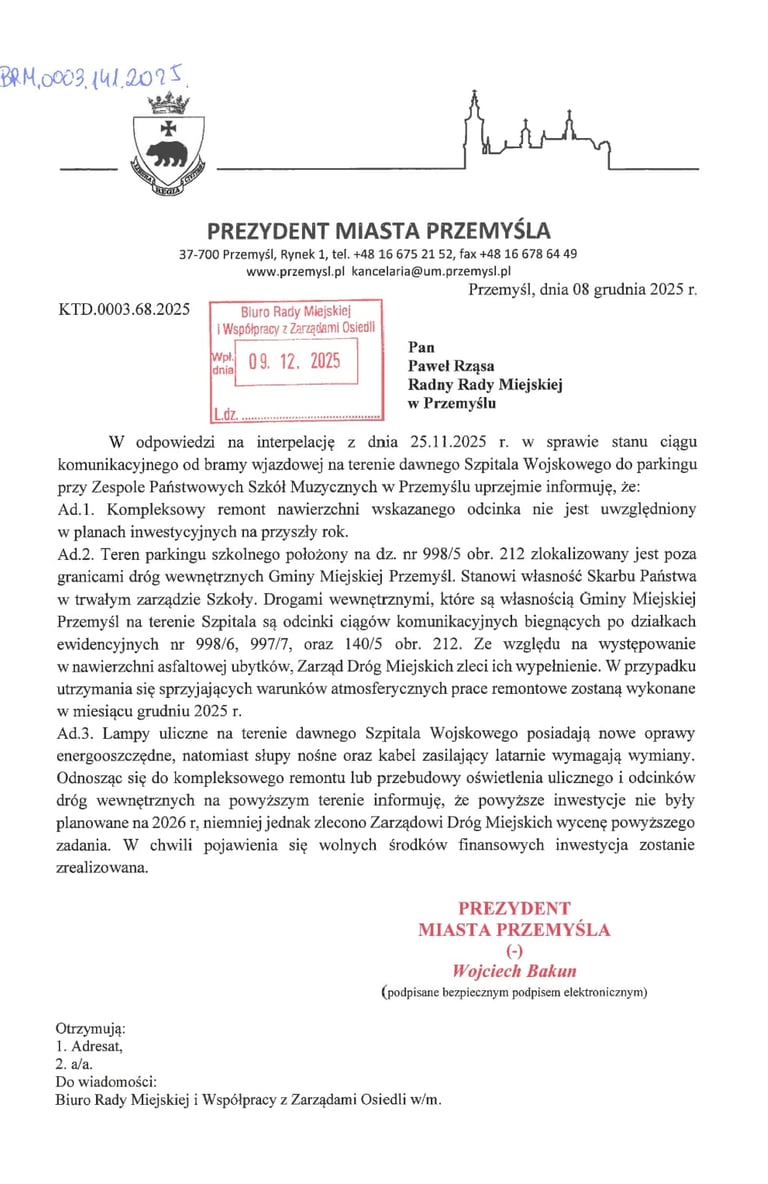 Interpelacja dotycząca stanu ciągu komunikacyjnego od bramy dawnego Szpitala Wojskowego do parkingu przy Zespole Państwowych Szkół Muzycznych im. A. Malawskiego w Przemyślu