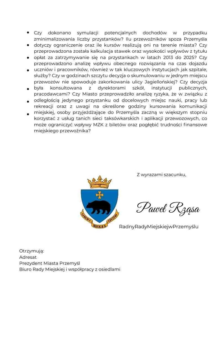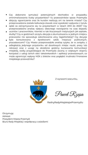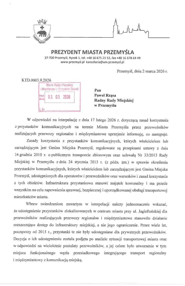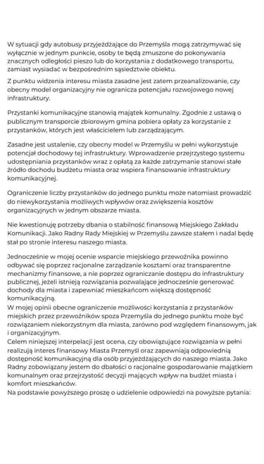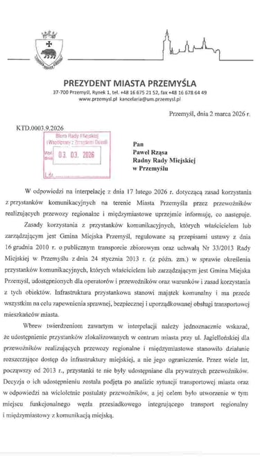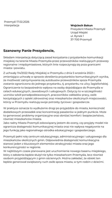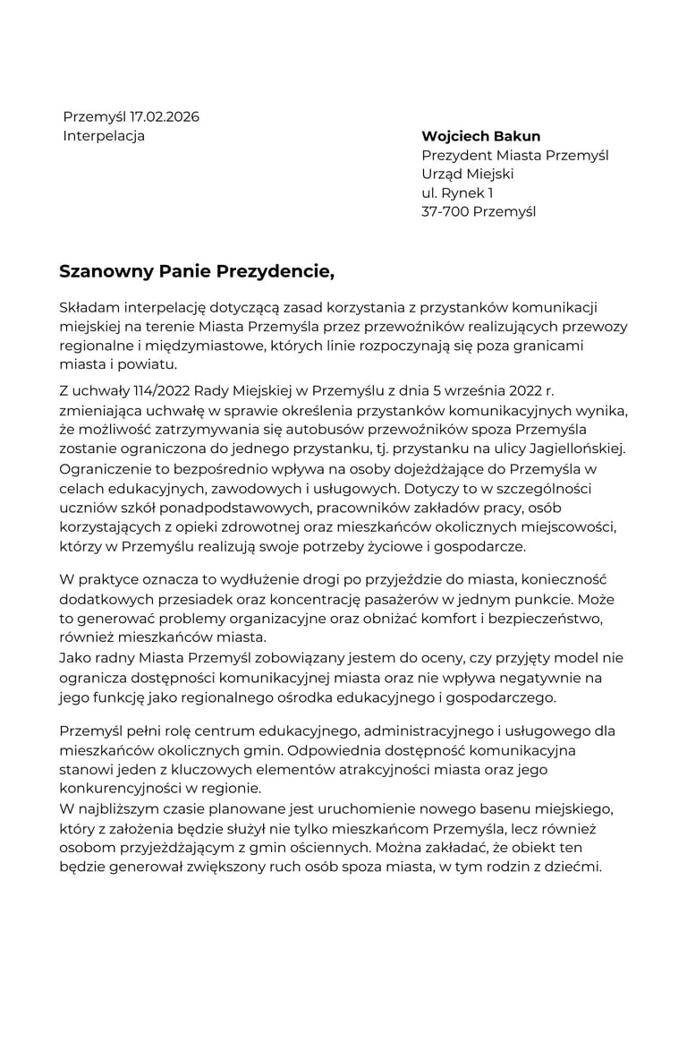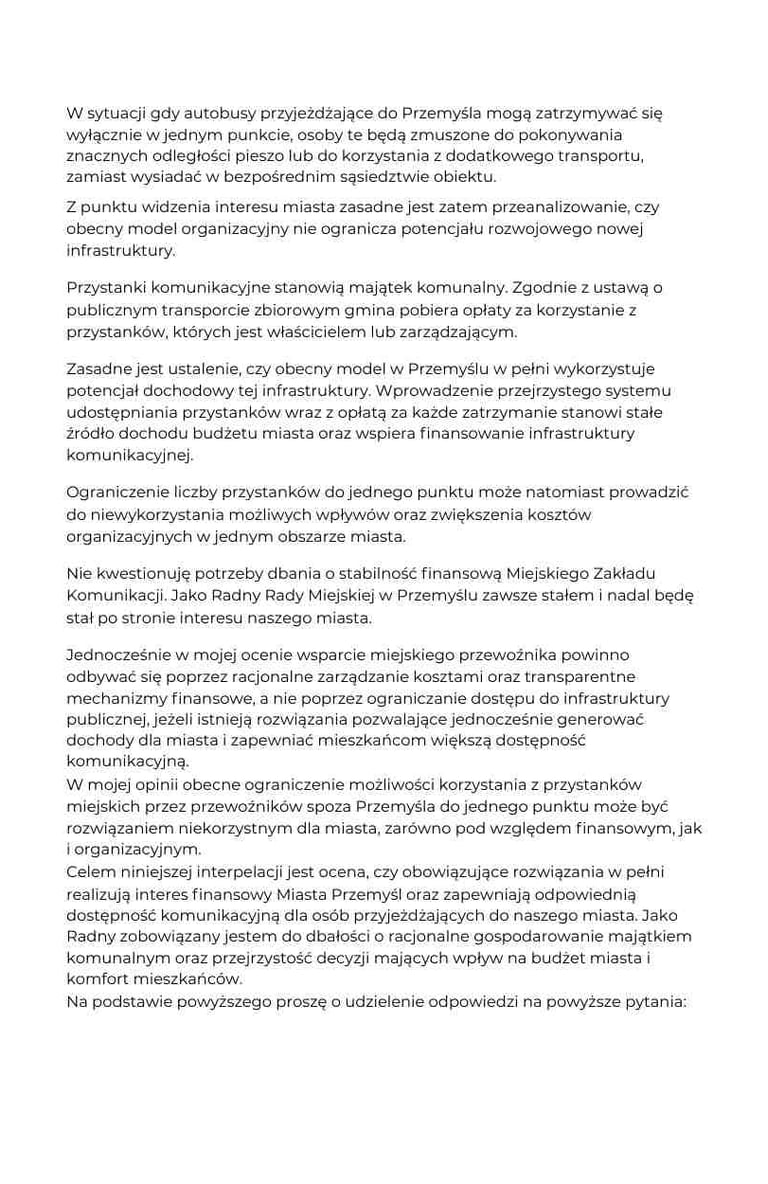 Interpelacja dotycząca zasad korzystania z przystanków komunikacji miejskiej na terenie Miasta Przemyśla przez przewoźników realizujących przewozy regionalne i międzymiastowe
