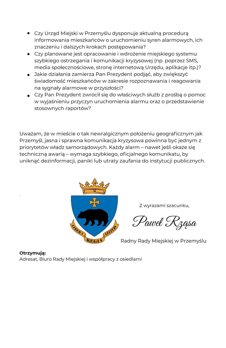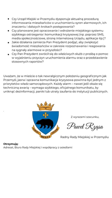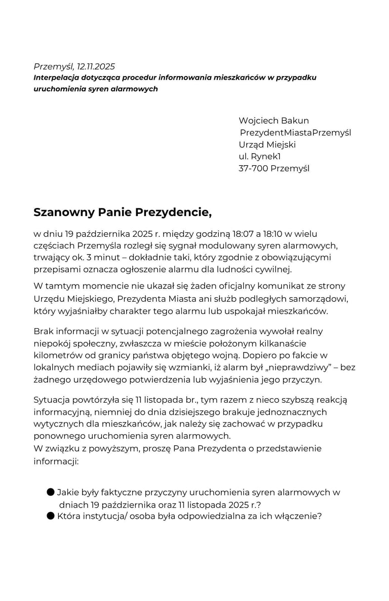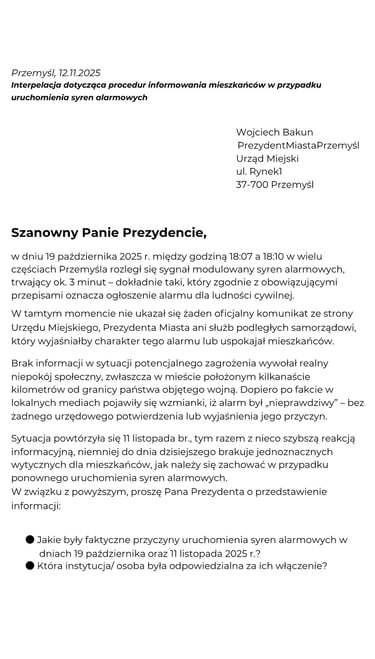 Interpelacja dotycząca procedur informowania mieszkańców w przypadku uruchomienia syren alarmowych.